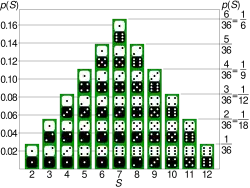 - La somme de deux variables aléatoires, même indépendantes, suivant des lois discrètes uniformes de même étendue suit une loi discrète non uniforme[9].