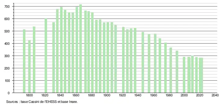L'évolution du nombre d'habitants est connue à travers les recensements de la population effectués dans la commune depuis 1793. Pour les communes de moins de 10 000 habitants, une enquête de recensement portant sur toute la population est réalisée tous les cinq ans, les populations de référence des années intermédiaires étant quant à elles estimées par interpolation ou extrapolation[18]. Pour la commune, le premier recensement exhaustif entrant dans le cadre du nouveau dispositif a été réalisé en 2005[19].