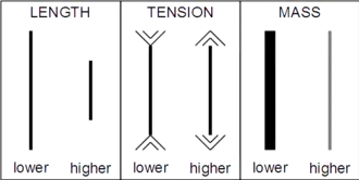 Ainsi, par exemple, toutes les autres propriétés de la corde étant égales, pour avoir une note une octave plus haut (2/1), il faut soit diminuer la longueur de la corde de moitié (1/2), soit augmenter sa tension du carré (4) ou diminuer sa masse linéique de l'inverse du carré (1/4).
