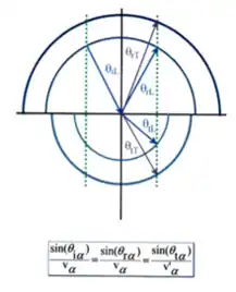 Les directions de propagation des ondes peuvent être déterminées graphiquement à partir des surfaces des lenteurs. En effet les lois de Snell-Descartes correspondent à la conservation de la projection sur l’interface des vecteurs lenteurs de toutes les ondes (incidente, réfléchie(s) et transmise(s)), comme illustré dans la figure ci-contre.