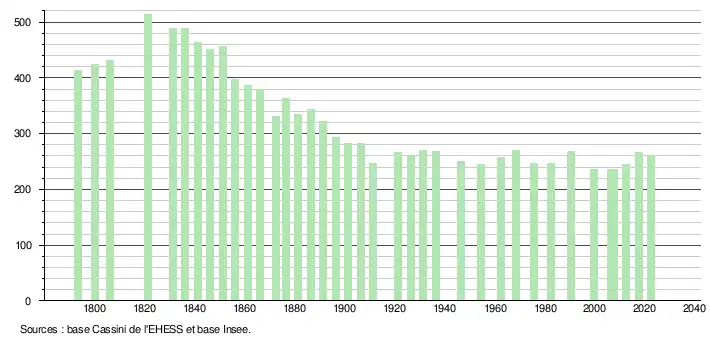 L'évolution du nombre d'habitants est connue à travers les recensements de la population effectués dans la commune depuis 1793. Pour les communes de moins de 10 000 habitants, une enquête de recensement portant sur toute la population est réalisée tous les cinq ans, les populations de référence des années intermédiaires étant quant à elles estimées par interpolation ou extrapolation[36]. Pour la commune, le premier recensement exhaustif entrant dans le cadre du nouveau dispositif a été réalisé en 2007[37].
