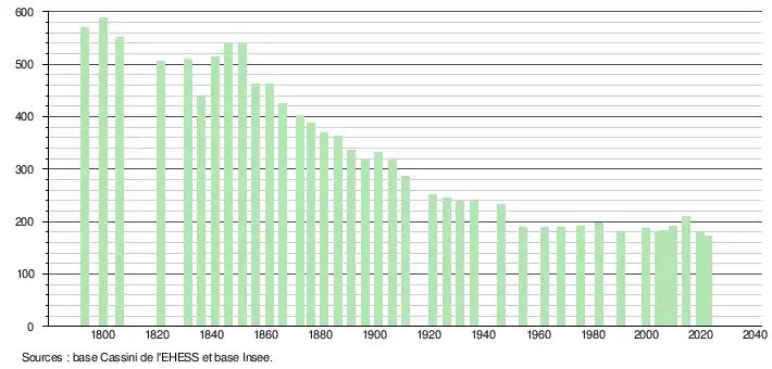 L'évolution du nombre d'habitants est connue à travers les recensements de la population effectués dans la commune depuis 1793. Pour les communes de moins de 10 000 habitants, une enquête de recensement portant sur toute la population est réalisée tous les cinq ans, les populations de référence des années intermédiaires étant quant à elles estimées par interpolation ou extrapolation[39]. Pour la commune, le premier recensement exhaustif entrant dans le cadre du nouveau dispositif a été réalisé en 2004[40].