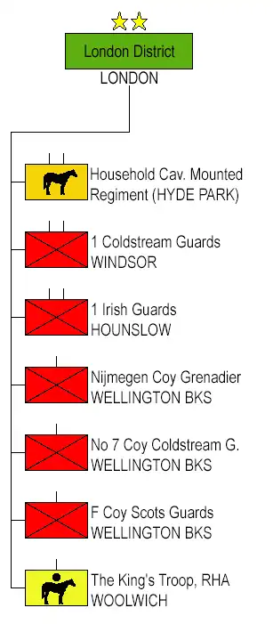 Le quartier général du London District est basé dans le bâtiment des Horse Guards dans le centre de Londres, et est sous les ordres du General Officer Commanding (Officier général commandant ou GOC), qui est simultanément nommé « Major-General Commanding the Household Division » (Major Général commandant de la Household Division).