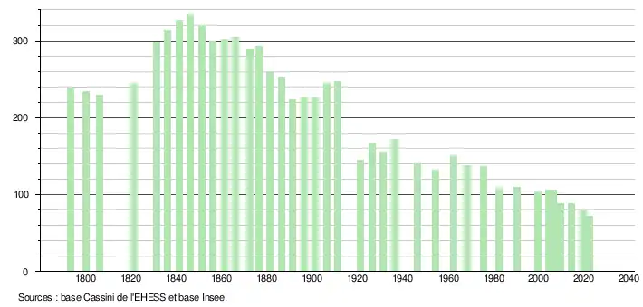 L'évolution du nombre d'habitants est connue à travers les recensements de la population effectués dans la commune depuis 1793. Pour les communes de moins de 10 000 habitants, une enquête de recensement portant sur toute la population est réalisée tous les cinq ans, les populations de référence des années intermédiaires étant quant à elles estimées par interpolation ou extrapolation[18]. Pour la commune, le premier recensement exhaustif entrant dans le cadre du nouveau dispositif a été réalisé en 2004[19].