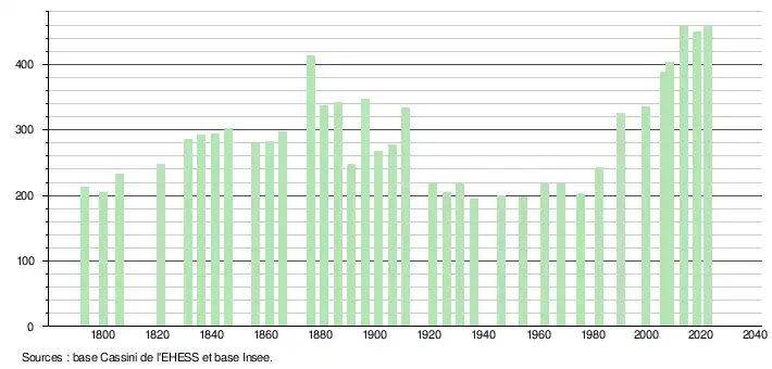 L'évolution du nombre d'habitants est connue à travers les recensements de la population effectués dans la commune depuis 1793. Pour les communes de moins de 10 000 habitants, une enquête de recensement portant sur toute la population est réalisée tous les cinq ans, les populations de référence des années intermédiaires étant quant à elles estimées par interpolation ou extrapolation[19]. Pour la commune, le premier recensement exhaustif entrant dans le cadre du nouveau dispositif a été réalisé en 2008[20].