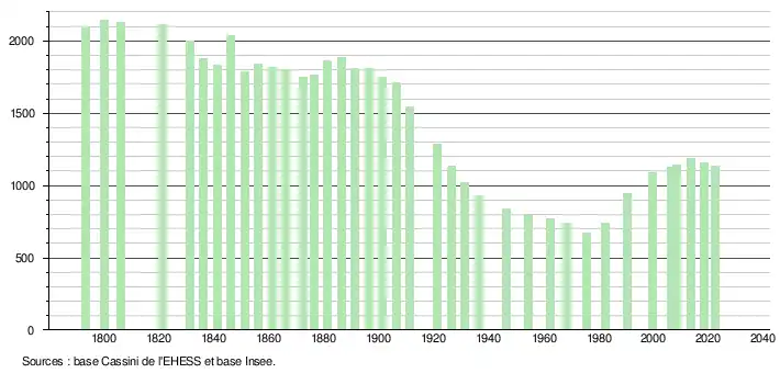 L'évolution du nombre d'habitants est connue à travers les recensements de la population effectués dans la commune depuis 1793. Pour les communes de moins de 10 000 habitants, une enquête de recensement portant sur toute la population est réalisée tous les cinq ans, les populations de référence des années intermédiaires étant quant à elles estimées par interpolation ou extrapolation[13]. Pour la commune, le premier recensement exhaustif entrant dans le cadre du nouveau dispositif a été réalisé en 2008[14].