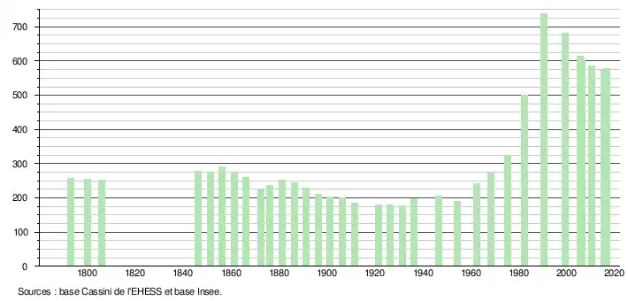 L'évolution du nombre d'habitants est connue à travers les recensements de la population effectués dans la commune depuis 1793. Pour les communes de moins de 10 000 habitants, une enquête de recensement portant sur toute la population est réalisée tous les cinq ans, les populations de référence des années intermédiaires étant quant à elles estimées par interpolation ou extrapolation[2]. Pour la commune, le premier recensement exhaustif entrant dans le cadre du nouveau dispositif a été réalisé en 2005[3].