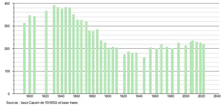 L'évolution du nombre d'habitants est connue à travers les recensements de la population effectués dans la commune depuis 1793. Pour les communes de moins de 10 000 habitants, une enquête de recensement portant sur toute la population est réalisée tous les cinq ans, les populations de référence des années intermédiaires étant quant à elles estimées par interpolation ou extrapolation[20]. Pour la commune, le premier recensement exhaustif entrant dans le cadre du nouveau dispositif a été réalisé en 2008[21].