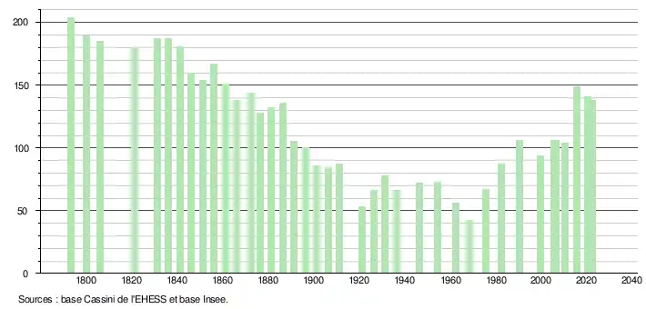 L'évolution du nombre d'habitants est connue à travers les recensements de la population effectués dans la commune depuis 1793. Pour les communes de moins de 10 000 habitants, une enquête de recensement portant sur toute la population est réalisée tous les cinq ans, les populations de référence des années intermédiaires étant quant à elles estimées par interpolation ou extrapolation[16]. Pour la commune, le premier recensement exhaustif entrant dans le cadre du nouveau dispositif a été réalisé en 2005[17].