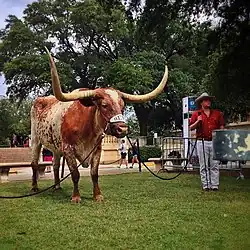 - Bevo (en) : C'est la mascotte de l'université. Il s'agit d'un bœuf à corne longue du Texas présent lors des matchs à domicile de l'équipe de football américain et lors de certains événements. La légende prétend que son nom provient d'un bœuf sur lequel des supporters des Aggies avaient badigeonné 13-0 — résultat d'une rencontre entre les universités — et que des étudiants de Texas auraient transformé en B3VO. En réalité, c'est un magazine d'anciens élèves de l'université qui avait utilisé cette dénomination plusieurs mois avant ces faits. Ce nom vient du terme d'argot désignant un bœuf destiné à devenir de la nourriture (beeve) ainsi que la pratique courante au cours des années 2000 d'ajouter un «O» à la fin des noms (comme pour Groucho ou Harpo Marx)[41].