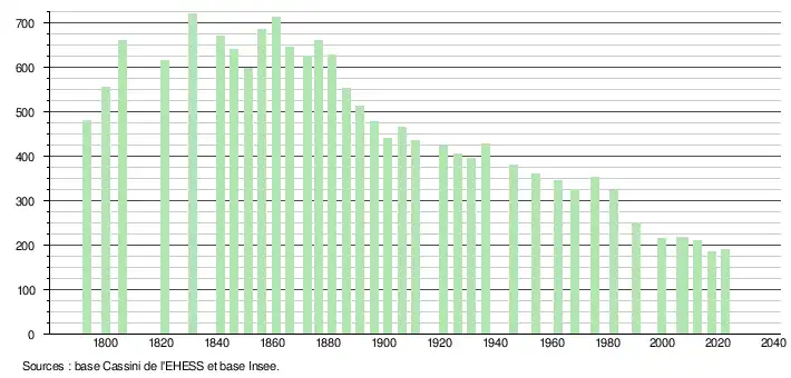 L'évolution du nombre d'habitants est connue à travers les recensements de la population effectués dans la commune depuis 1793. Pour les communes de moins de 10 000 habitants, une enquête de recensement portant sur toute la population est réalisée tous les cinq ans, les populations de référence des années intermédiaires étant quant à elles estimées par interpolation ou extrapolation[29]. Pour la commune, le premier recensement exhaustif entrant dans le cadre du nouveau dispositif a été réalisé en 2007[30].