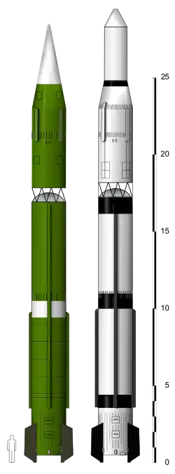 - ↑ Diamètre maximal de l'étage. Ne prend pas en compte la présence d'ailerons aérodynamiques.