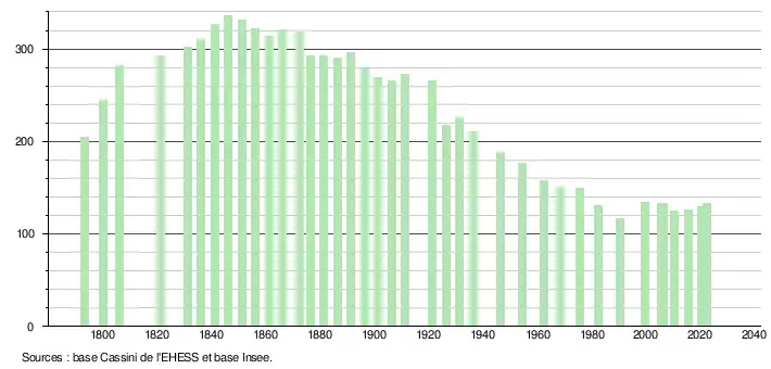 L'évolution du nombre d'habitants est connue à travers les recensements de la population effectués dans la commune depuis 1793. Pour les communes de moins de 10 000 habitants, une enquête de recensement portant sur toute la population est réalisée tous les cinq ans, les populations de référence des années intermédiaires étant quant à elles estimées par interpolation ou extrapolation[17]. Pour la commune, le premier recensement exhaustif entrant dans le cadre du nouveau dispositif a été réalisé en 2005[18].