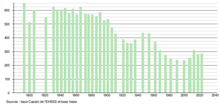 L'évolution du nombre d'habitants est connue à travers les recensements de la population effectués dans la commune depuis 1793. Pour les communes de moins de 10 000 habitants, une enquête de recensement portant sur toute la population est réalisée tous les cinq ans, les populations de référence des années intermédiaires étant quant à elles estimées par interpolation ou extrapolation[24]. Pour la commune, le premier recensement exhaustif entrant dans le cadre du nouveau dispositif a été réalisé en 2007[25].