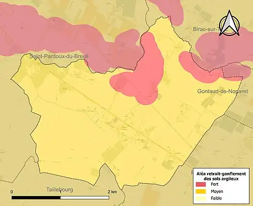 Le retrait-gonflement des sols argileux est susceptible d'engendrer des dommages importants aux bâtiments en cas d’alternance de périodes de sécheresse et de pluie[21]. La totalité de la commune est en aléa moyen ou fort (91,8 % au niveau départemental et 48,5 % au niveau national)[Carte 2]. Depuis le , en application de la loi ELAN, différentes contraintes s'imposent aux vendeurs, maîtres d'ouvrages ou constructeurs de biens situés dans une zone classée en aléa moyen ou fort[Note 4],[22].
