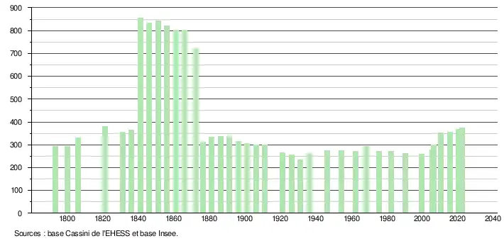 | L'évolution du nombre d'habitants est connue à travers les recensements de la population effectués dans la commune depuis 1793. Pour les communes de moins de 10 000 habitants, une enquête de recensement portant sur toute la population est réalisée tous les cinq ans, les populations de référence des années intermédiaires étant quant à elles estimées par interpolation ou extrapolation[26]. Pour la commune, le premier recensement exhaustif entrant dans le cadre du nouveau dispositif a été réalisé en 2005[27]. En 2022, la commune comptait 375 habitants[Note 6], en évolution de +3,02 % par rapport à 2016 (Lot-et-Garonne : −0,18 %, France hors Mayotte : +2,11 %). |
