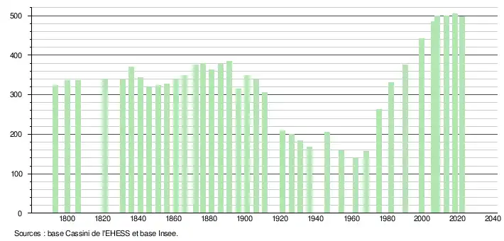 L'évolution du nombre d'habitants est connue à travers les recensements de la population effectués dans la commune depuis 1793. Pour les communes de moins de 10 000 habitants, une enquête de recensement portant sur toute la population est réalisée tous les cinq ans, les populations de référence des années intermédiaires étant quant à elles estimées par interpolation ou extrapolation[16]. Pour la commune, le premier recensement exhaustif entrant dans le cadre du nouveau dispositif a été réalisé en 2008[17].