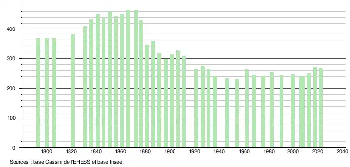 L'évolution du nombre d'habitants est connue à travers les recensements de la population effectués dans la commune depuis 1793. Pour les communes de moins de 10 000 habitants, une enquête de recensement portant sur toute la population est réalisée tous les cinq ans, les populations de référence des années intermédiaires étant quant à elles estimées par interpolation ou extrapolation[13]. Pour la commune, le premier recensement exhaustif entrant dans le cadre du nouveau dispositif a été réalisé en 2007[14].