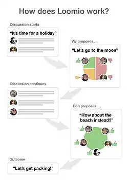 Loomio est un logiciel libre axé sur la prise de décision au sein de collectifs. Il constitue plus particulièrement une application web qui met en œuvre un réseau social permettant à tout groupe ou organisation, quelle que soit sa taille ou sa forme, de collaborer pour aboutir à des décisions communes prenant en compte les points de vue des différentes parties. Ce fonctionnement représente une tentative de transposition dans le monde numérique de plusieurs principes de gouvernance égalitaire[6], typique des Civic-Tech[7].