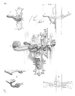 - Loquet à vielle – composé d'une platine, d'une manivelle comme celle d'une vielle, et s'ouvre avec une clef ; il sert ordinairement à la fermeture des portes des lieux d'aisance[S 1].