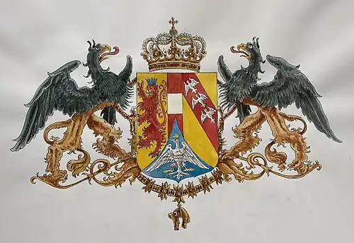 Armes : « tiercé en pal (1) d'or au lion de gueules armé, lampassé et couronné d'azur, (2) de gueules à la fasce d'argent et (3) d'or à la bande de gueules chargée de trois alérions d'argent (Habsbourg-Lorraine), mantelé d'azur à l'aigle d'argent, becquée, languée et couronnée d'or (Este) »[30].