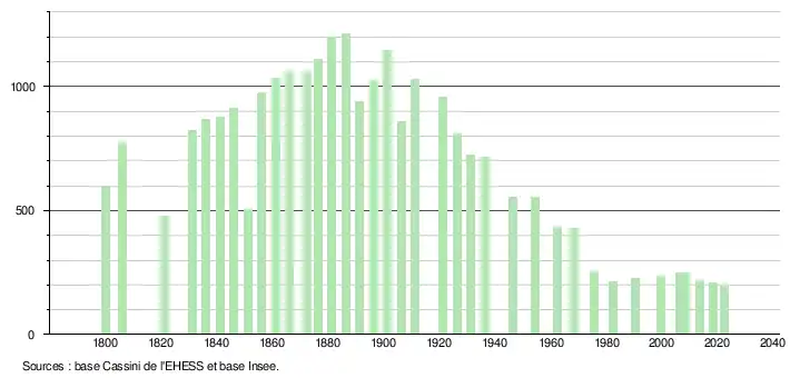 L'évolution du nombre d'habitants est connue à travers les recensements de la population effectués dans la commune depuis 1800. Pour les communes de moins de 10 000 habitants, une enquête de recensement portant sur toute la population est réalisée tous les cinq ans, les populations de référence des années intermédiaires étant quant à elles estimées par interpolation ou extrapolation[7]. Pour la commune, le premier recensement exhaustif entrant dans le cadre du nouveau dispositif a été réalisé en 2008[8].