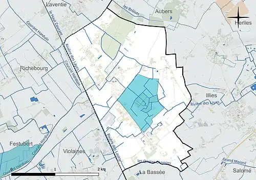 La commune est limitée à l'ouest par le tracé rectiligne de l'ancienne route nationale 347 (actuelle RD 947), qui relie notamment La Bassée à Estaires.