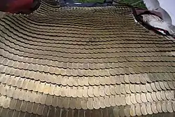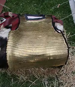Le fer et l'acier paraissent avoir été utilisés en quasi-exclusivité par les légions romaines. Les légionnaires semblent avoir retenu une série de modèles où les « écailles », disposées en rangs horizontaux, étaient fixées par leurs sommets et où les parties basses restaient libres. Chaque rang étant décalé par rapport au suivant, la disposition de l’ensemble rappelle la disposition des tuiles sur un toit. La fixation était assurée par des paires de trous en haut de l’écaille. Les écailles étaient souvent bombées ou nervurées, pour une résistance accrue.