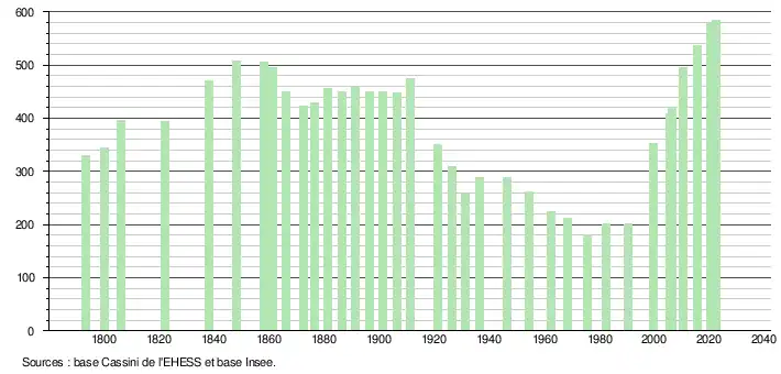 L'évolution du nombre d'habitants est connue à travers les recensements de la population effectués dans la commune depuis 1793. Pour les communes de moins de 10 000 habitants, une enquête de recensement portant sur toute la population est réalisée tous les cinq ans, les populations de référence des années intermédiaires étant quant à elles estimées par interpolation ou extrapolation[7]. Pour la commune, le premier recensement exhaustif entrant dans le cadre du nouveau dispositif a été réalisé en 2005[8].