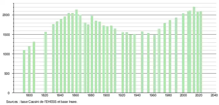L'évolution du nombre d'habitants est connue à travers les recensements de la population effectués dans la commune depuis 1793. Pour les communes de moins de 10 000 habitants, une enquête de recensement portant sur toute la population est réalisée tous les cinq ans, les populations de référence des années intermédiaires étant quant à elles estimées par interpolation ou extrapolation[25]. Pour la commune, le premier recensement exhaustif entrant dans le cadre du nouveau dispositif a été réalisé en 2008[26].