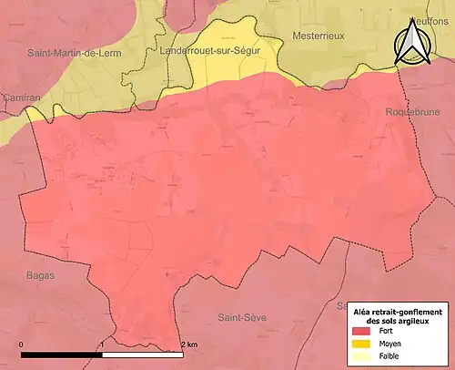 Le retrait-gonflement des sols argileux est susceptible d'engendrer des dommages importants aux bâtiments en cas d’alternance de périodes de sécheresse et de pluie. La totalité de la commune est en aléa moyen ou fort (67,4 % au niveau départemental et 48,5 % au niveau national). Sur les 141 bâtiments dénombrés sur la commune en 2019, 141 sont en aléa moyen ou fort, soit 100 %, à comparer aux 84 % au niveau départemental et 54 % au niveau national. Une cartographie de l'exposition du territoire national au retrait gonflement des sols argileux est disponible sur le site du BRGM[18],[Carte 2].
