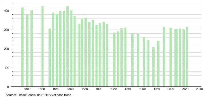L'évolution du nombre d'habitants est connue à travers les recensements de la population effectués dans la commune depuis 1793. Pour les communes de moins de 10 000 habitants, une enquête de recensement portant sur toute la population est réalisée tous les cinq ans, les populations de référence des années intermédiaires étant quant à elles estimées par interpolation ou extrapolation[21]. Pour la commune, le premier recensement exhaustif entrant dans le cadre du nouveau dispositif a été réalisé en 2007[22].
