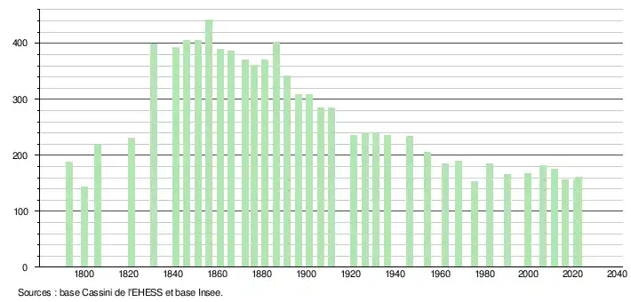 | L'évolution du nombre d'habitants est connue à travers les recensements de la population effectués dans la commune depuis 1793. Pour les communes de moins de 10 000 habitants, une enquête de recensement portant sur toute la population est réalisée tous les cinq ans, les populations de référence des années intermédiaires étant quant à elles estimées par interpolation ou extrapolation[22]. Pour la commune, le premier recensement exhaustif entrant dans le cadre du nouveau dispositif a été réalisé en 2006[23]. En 2022, la commune comptait 161 habitants[Note 4], en évolution de +3,21 % par rapport à 2016 (Gers : +1,04 %, France hors Mayotte : +2,11 %). |
