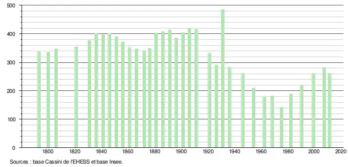 L'évolution du nombre d'habitants est connue à travers les recensements de la population effectués dans la commune depuis 1793. À partir du , les populations légales des communes sont publiées annuellement dans le cadre d'un recensement qui repose désormais sur une collecte d'information annuelle, concernant successivement tous les territoires communaux au cours d'une période de cinq ans. Pour les communes de moins de 10 000 habitants, une enquête de recensement portant sur toute la population est réalisée tous les cinq ans, les populations légales des années intermédiaires étant quant à elles estimées par interpolation ou extrapolation[7]. Pour la commune, le premier recensement exhaustif entrant dans le cadre du nouveau dispositif a été réalisé en 2007[8],[Note 1].
