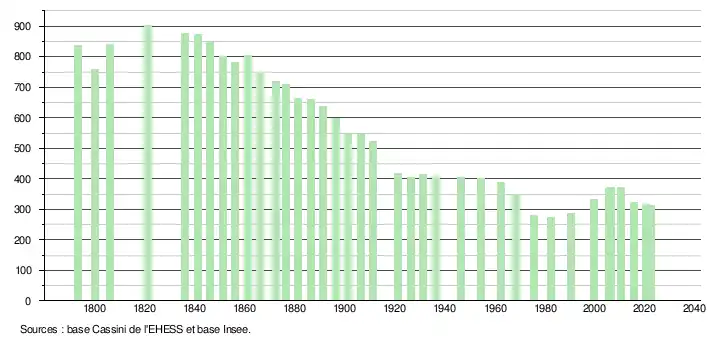 L'évolution du nombre d'habitants est connue à travers les recensements de la population effectués dans la commune depuis 1793. Pour les communes de moins de 10 000 habitants, une enquête de recensement portant sur toute la population est réalisée tous les cinq ans, les populations de référence des années intermédiaires étant quant à elles estimées par interpolation ou extrapolation[26]. Pour la commune, le premier recensement exhaustif entrant dans le cadre du nouveau dispositif a été réalisé en 2005[27].