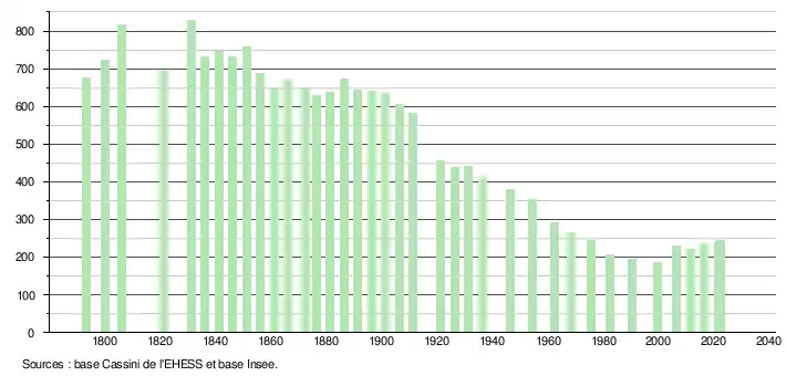 L'évolution du nombre d'habitants est connue à travers les recensements de la population effectués dans la commune depuis 1793. Pour les communes de moins de 10 000 habitants, une enquête de recensement portant sur toute la population est réalisée tous les cinq ans, les populations de référence des années intermédiaires étant quant à elles estimées par interpolation ou extrapolation[19]. Pour la commune, le premier recensement exhaustif entrant dans le cadre du nouveau dispositif a été réalisé en 2006[20].