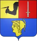 Coupé, au premier parti à dextre d'or au dextrochère gantelé de sable, mouvant à sénestre, tenant un compas ouvert du même ; à sénestre de gueules au signe des barons tirés de l'armée, au deuxième d'azur à la tête de Minerve en profil d'or[8],[9]. |