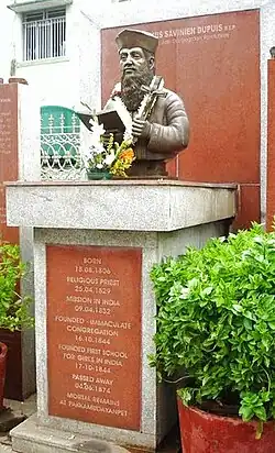 Monsieur[20] Dupuis meurt en 1874 à Pondichéry, et il est inhumé dans le cimetière de la cathédrale. À sa mort, la congrégation comprend 80 sœurs en dix couvents et enseignant dans douze écoles[21].