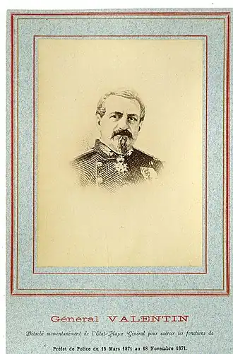 Louis Ernest Valentin, né le à Paris et mort le à Montauban, est un général de brigade (nommé le ). Il exerce les fonctions de Préfet de Police à Paris à partir du jusqu'au de la même année[2]. Il joue un rôle non négligeable au côté du gouvernement pendant la Commune. Il contribue au rétablissement de l'ordre après l'échec de celle-ci.