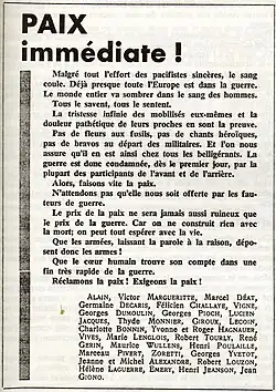 Dès la déclaration de la Seconde Guerre mondiale, en , Louis Lecoin rédigea un tract intitulé « Paix immédiate », distribué à 100 000 exemplaires avec l'aide de Nicolas Faucier et Albert Dremière[9]. Il obtint la signature de 31 pacifistes de gauche comme Marcel Déat, Alain, Jean Giono, Félicien Challaye, Victor Margueritte, Henri Jeanson, Marceau Pivert, Georges Pioch, Ludovic Zoretti, Léon Émery, Georges Dumoulin[10]. Une enquête pour infraction au décret-loi du interdisant les actes pouvant porter atteinte au moral de l'armée et de la population fut ouverte par le tribunal militaire de Paris. Le juge, le capitaine Marchat, convoqua Lecoin et les signataires, qui souvent se désolidarisèrent de Lecoin et du tract[11]. Lecoin est défendu par Me Alexandre Zévaès[12]. Arrêté à Angers, il est incarcéré à la prison de la Santé début , alors que la plupart des autres signataires n'étaient qu'inculpés[13], puis il est évacué au Camp de Gurs[14]. Il ne retrouva la liberté que le avec des pacifistes « qui n'avaient commis d'autre crime que d’être contre la guerre voulue par les Anglais, par Staline et par la clique de leurs valets, indûment préposée au gouvernement de la France. », selon Marcel Déat dans le journal L’Œuvre, qu'il dirige alors. Déat avait signé le tract et était devenu collaborationniste[15].