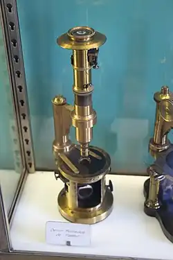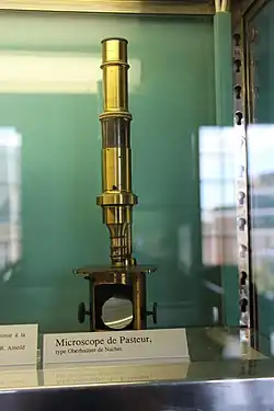 Pasteur « dispose d'une première orientation donnée par Cagniard de Latour ; il la développe et montre que c'est en tant qu'être vivant que la levure agit, et non en tant que matière organique en décomposition »[67]. Ces travaux bénéficient de la mise au point des premiers objectifs achromatiques dépourvus d'irisation parasite[68]. De 1857[69] à 1867, il publie des études sur les fermentations. Inaugurant la méthode des cultures pures[70], il établit que certaines fermentations (lactique, butyrique[71]) où on n'avait pas aperçu de substance jouant un rôle analogue à celui de la levure[72] (ce qui avait servi d'argument à Liebig[73]) sont bel et bien l'œuvre d'organismes vivants[74].