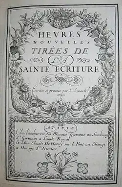 - Heures nouvelles dédiées à Madame la Dauphine. Ecrites et gravées par L. Senault. Paris : auteur et Versailles, Duval (c. 1685). 8° (Paris BNF : B-5334, daté 1685 à la main au titre). Cat. Jammes no 39.