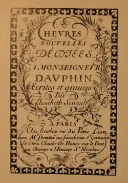 - Heures nouvelles dédiées à Monseigneur le Dauphin. Ecrites et gravées par Elisabeth Senault. Paris : chez Claude de Hansy (c. 1710). 8°, 188 p. (Chicago NL, Lyon BM). Cat. Warmelink no 606.