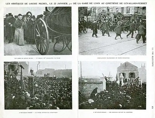 Lors de ses funérailles, de nombreux orateurs prennent la parole et, parmi eux, le vénérable de la loge « Fraternité Universelle »[5] appartenant à la « Grande Loge symbolique écossaise, mixte et maintenue »[69],[N 2]. Selon Jean Maitron, « des insignes ou emblèmes maçonniques ayant été déposés sur le cercueil, les organisateurs des obsèques firent remarquer que Louise Michel n'appartenait à aucune association »[5].