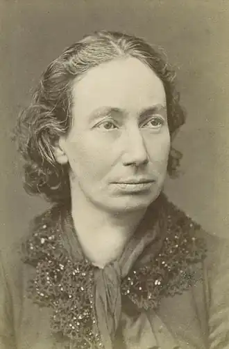Louise Michel , alias « Enjolras », née le à Vroncourt-la-Côte[3] et morte le à Marseille, est une institutrice, écrivaine, militante anarchiste, franc-maçonne française aux idées féministes et l’une des figures majeures de la Commune de Paris durant laquelle elle s'implique tant politiquement que militairement en intégrant les rangs de la Garde nationale. Elle est aussi une des représentantes les plus célèbres de la part prise par les femmes dans la Commune de Paris.