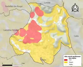 Le retrait-gonflement des sols argileux est susceptible d'engendrer des dommages importants aux bâtiments en cas d’alternance de périodes de sécheresse et de pluie. 74,8 % de la superficie communale est en aléa moyen ou fort (67,7 % au niveau départemental et 48,5 % au niveau national). Sur les 203 bâtiments dénombrés sur la commune en 2019, 175 sont en aléa moyen ou fort, soit 86 %, à comparer aux 72 % au niveau départemental et 54 % au niveau national. Une cartographie de l'exposition du territoire national au retrait gonflement des sols argileux est disponible sur le site du BRGM[25],[Carte 2].