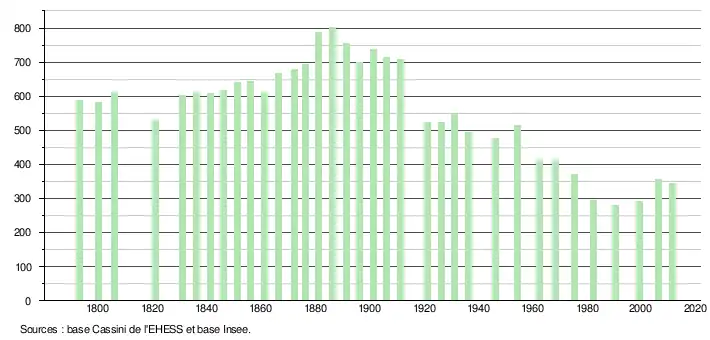 L'évolution du nombre d'habitants est connue à travers les recensements de la population effectués dans la commune depuis 1793. À partir du , les populations légales des communes sont publiées annuellement dans le cadre d'un recensement qui repose désormais sur une collecte d'information annuelle, concernant successivement tous les territoires communaux au cours d'une période de cinq ans. Pour les communes de moins de 10 000 habitants, une enquête de recensement portant sur toute la population est réalisée tous les cinq ans, les populations légales des années intermédiaires étant quant à elles estimées par interpolation ou extrapolation[4]. Pour la commune, le premier recensement exhaustif entrant dans le cadre du nouveau dispositif a été réalisé en 2006[5],[Note 1].