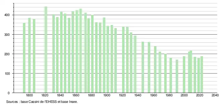 | L'évolution du nombre d'habitants est connue à travers les recensements de la population effectués dans la commune depuis 1793. Pour les communes de moins de 10 000 habitants, une enquête de recensement portant sur toute la population est réalisée tous les cinq ans, les populations de référence des années intermédiaires étant quant à elles estimées par interpolation ou extrapolation[20]. Pour la commune, le premier recensement exhaustif entrant dans le cadre du nouveau dispositif a été réalisé en 2008[21]. En 2022, la commune comptait 188 habitants[Note 2], en évolution de +7,43 % par rapport à 2016 (Landes : +5,78 %, France hors Mayotte : +2,11 %). |