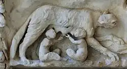 Selon le mythe rapporté par Tite-Live et Denys d'Halicarnasse, la vestale Rhéa Silvia s'est unie au dieu Mars et a donné naissance à des jumeaux, Romulus et Remus. Le roi Numitor, grand-père des jumeaux, est renversé par son frère Amulius à Albe la Longue. Pour éviter que les petits-enfants, une fois devenus adultes, puissent revendiquer le trône usurpé, Amulius ordonne qu'ils soient jetés dans le Tibre dans un panier. Les jumeaux sont recueillis par une louve au pied du mont Palatin, sous un figuier sauvage (le Ficus Ruminalis) situé devant l'entrée de la grotte du Lupercal. L'animal les aurait nourris et protégés jusqu'à ce qu'un berger, Faustulus, les trouve et les élève. Devenus adultes, les deux frères retournent à l'endroit de leur abandon et y fondent la ville de Rome[2],[3].