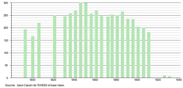 - ↑ Dans le tableau des recensements et le graphique, par convention dans Wikipédia, et afin de permettre une comparaison correcte entre des recensements espacés d’une période de cinq ans, le principe a été retenu, pour les populations légales postérieures à 1999 de n’afficher dans le tableau des recensements et le graphique que les populations correspondant aux années 2006, 2011, 2016, etc., ainsi que la dernière population légale publiée par l’Insee.